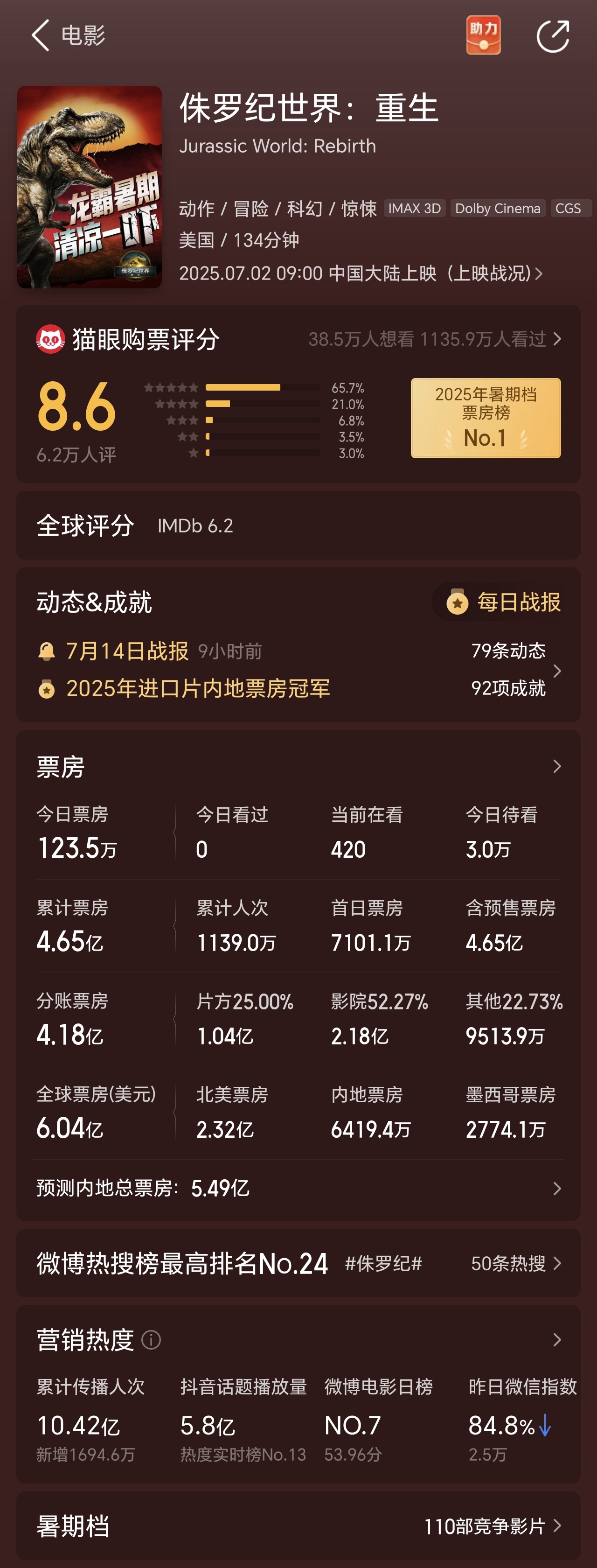 恐龙科幻电影《侏罗纪世界:重生》登顶 2025 进口片票房冠军,累计票房 4.65 亿